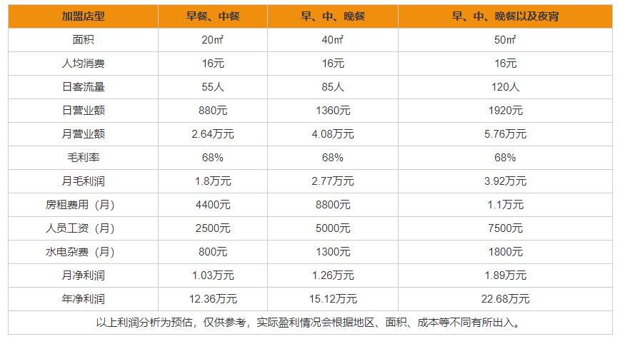 满朝佰家粥铺怎么样?可见,通过上表,我们可以看出,满朝佰家粥铺加盟利润在早餐、中餐月利润是1.03万元,年利润是12.36万元、早、中、晚餐月利润是1.26万元,年利润是15.12万元、早、中、晚餐以及夜宵月利润是1.89万元,年利润是22.68万元。当然,以上的利润分析也是初步估计的,并不是绝对的,具体能不能赚钱还需要根据实际情况来定,还得考虑到自身店铺位置、客流等情况。