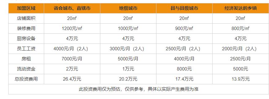 鸡不渴失加盟费多少?可以看出,鸡不渴失加盟费用省会城市、直辖市加盟需要投资26.4万元,地级城市加盟需要投资20.2万元,县与县级城市加盟需要投资17.4万元,经济发达的乡镇加盟需要13.9万元。当然这些数据只是给大家一些实践指导,具体还要以加盟商的实际情况为准,可能会稍微有点差别但浮动不大!