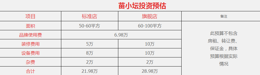 如果您想加盟标准店,店铺面积在50-60平方,苗小坛品牌费是6.98万,店铺装修费用5万,设备费用8万,其它杂费算2万,加起来是21.98万。如果日营业额3000-5000元,投资回报仅需4-6个月就可以了。按照15万的月销售额,月净收益是3.45万,属于高回报能赚钱的餐饮项目。