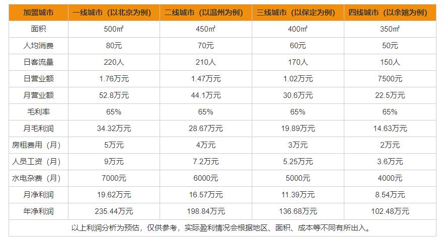 通过以上表格可以发现,老五烧烤加盟利润在一线城市(以北京为例)月利润是19.62万元,年利润是235.44万元、二线城市(以温州为例)月利润是16.57万元,年利润是198.84万元、三线城市(以保定为例)月利润是11.39万元,年利润是136.68万元、四线城市(以余姚为例)月利润是8.54万元,年利润是102.48万元。看了这么多利润,您还不会心动吗?