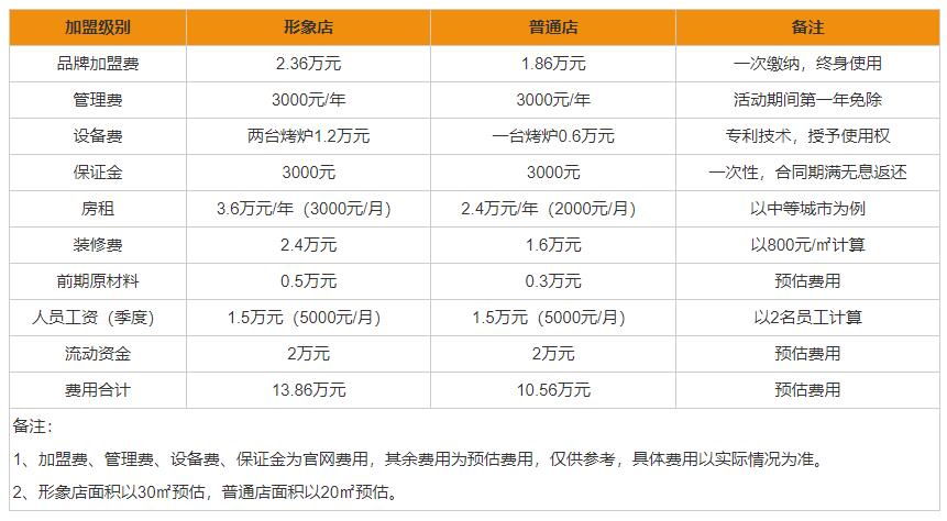 看完了上表,我们也知道了,不同城市所需的费用也是不同的,张成荣电烤鸡架加盟费分别是形象店需要13.86万元、普通店需要10.56万元。