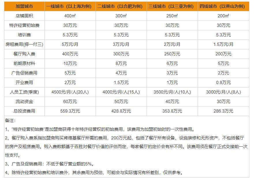 肯德基加盟费多少钱?由此可见,肯德基加盟费多少钱的详情是:一线城市加盟需要559.3万元,二线城市加盟需要428.8万元,三线城市加盟需要353.8万元,四线城市加盟需要286.3万元。相信上表展示肯德基加盟费已经足够详细了,看完之后您应该心中有数了才对,大家可以从自身的实际情况出发来选择最适合自己的加盟模式。