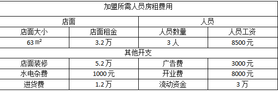 消费者看重的是它的味道,而投资者看重的是它的盈利前景。方中山胡辣汤所需的加盟费用包括:加盟费4.9万,保证金8200元,品牌使用费3300元,管理费2400元。由于店铺规模大小不同,所需的投资也会稍有变化,以一家63㎡的加盟店为例: