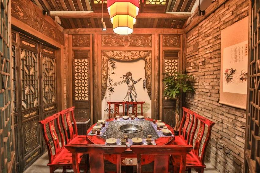 在门店形象上,武侠是从面到点的细致呈现。亭台楼阁、青砖木柱、雕花屏窗等内景设置古色古香;点苍派、嵩山派、衡山派等武功门派是包间的区隔标签;墙上手绘了各色大侠英雄,看到张无忌就想到明教,看到谢逊能自然想起屠龙宝刀,进而《倚天屠龙记》那一段荡气回肠的江湖故事也许就成为了吃火锅间隙的谈资……还有定制的“龙头锅”、土陶餐具,江湖式的上菜和服务方式等等,武侠江湖里的热血和火锅的热辣相得益彰。