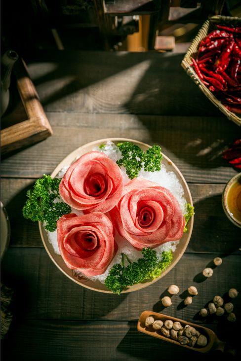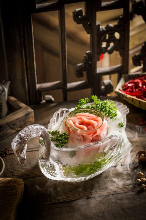 简单来说,就是给产品“凹造型”。比如蜀大侠的鹅肠,不是随意摆放在菜叶上,而是专门设计了透明玻璃球盛好,加以干冰催化的烟雾,鹅肠因此更显粉嫩鲜脆;还有将片状的牛舌卷制成盛开的玫瑰花模样,两种口味的虾滑摆出太极图案,猪肝切得又宽又薄,像大刀片子。还有牛肉,别家的牛肉基本上是平铺在盘子上的,蜀大侠结合了成都串串的形式,变成牛肉串串,由“侠宝”抱上桌,就显得别致了。