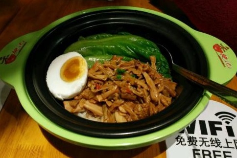 在等待的途中,小编也观察了店内的生意情况,顺便也问了几位顾客,发现都是这家店的常客,对它家的味道还是颇为推崇的,还向我推荐了比较经典的几个口味,这样的热情真是很少在其他煲仔饭见到。过了几分钟,小编终于尝到了这道煲仔饭,平心而论味道确实有独到之处,加上配套的小吃,是平时上班就餐的不错选择。最主要的出餐速度快,虽然店里有那么多人,但还是能在5分钟以内吃上热腾腾的煲仔饭。