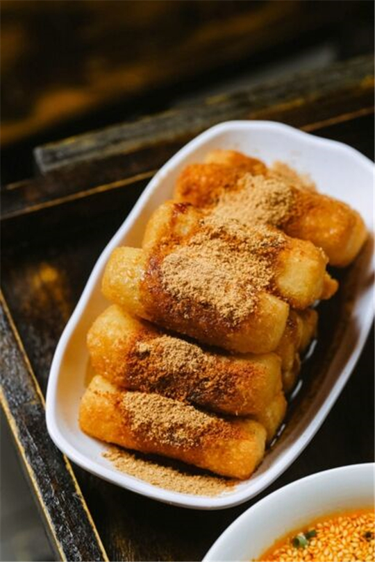 糍粑的韧性粘度非常好,千锤百炼出的黏糍粑,下锅炸至金黄,再把红糖炒制成粘稠的红糖汁,拉扯能看的见丝的那种,浇在金黄的糍粑上面,颜色异常美丽,入口甜糯酥软。