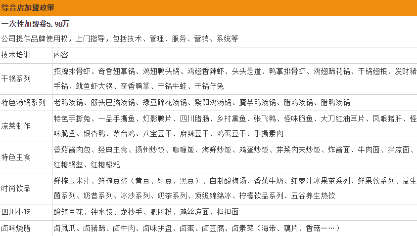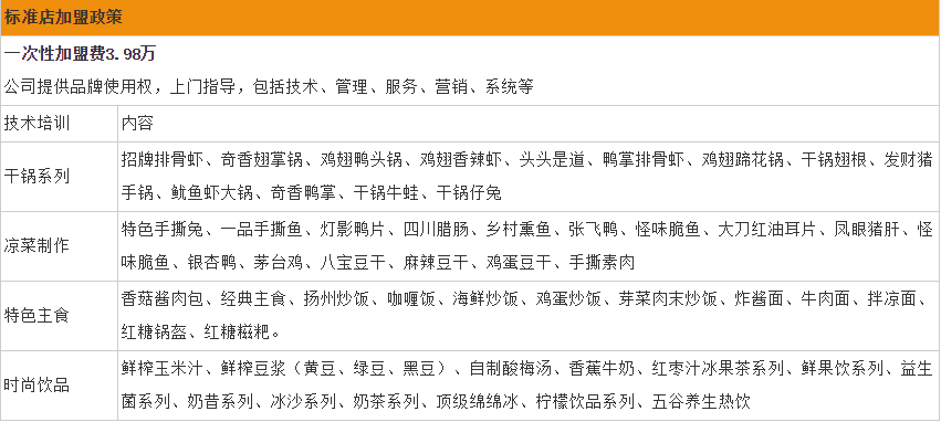 通过以上表格可以看出,一品香锅加盟费分别是:标准店一次性加盟费为3.98万元,综合店加盟费为5.98万元,大家可以根据自身经济实力看一下,是否适合加盟。Jjr加盟商机网