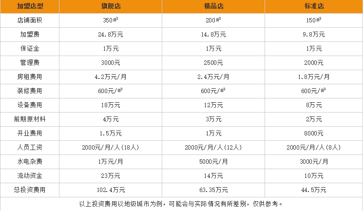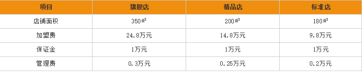 从上图可以看出,开一家面积为350㎡的旗舰店来说,总投资费用为102.4万元;开一家面积为200㎡的精品店来说,总投资费用为63.35万元;开一家面积为150㎡的标准店来说,总投资费用为44.5万元。ukz加盟商机网