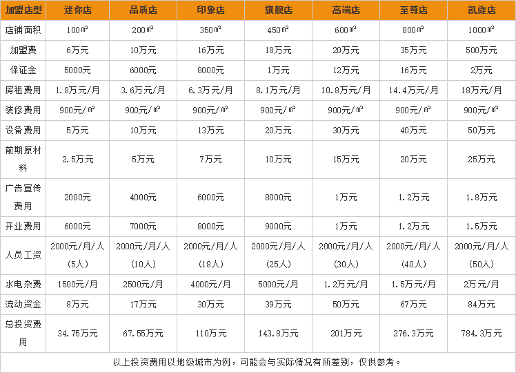 从上图可以看出,开一家店铺面积为100㎡的迷你店所需要的总投资费用为34.75万元;开一家店铺面积为200㎡的品质店所需要的总投资费用为67.55万元;开一家店铺面积为350㎡的印象店所需要的总投资费用为110万元;开一家店铺面积为450㎡的旗舰店所需要的总投资费用143.8为万元;开一家店铺面积为600㎡的高端店所需要的总投资费用为201万元;开一家店铺面积为800㎡的至尊店所需要的总投资费用为276.3万元;开一家店铺面积为1000㎡的凯旋店所需要的总投资费用为784.3万元。