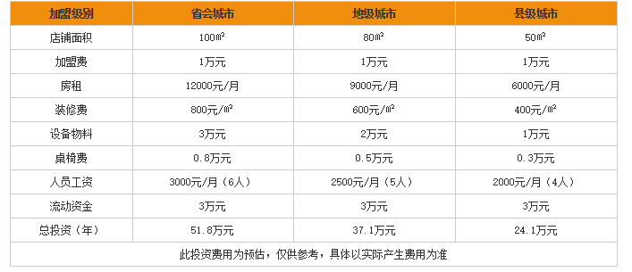 上图看出,姝函·老友记黄焖鸡米饭加盟费一律为1万。省会城市开一家店铺需要总的投资为51.8万元;地级城市开一家需要总的投资为37.1万元;县级城市开一家需要投入24.1万元,也就是说,最低只需要24.1万元就可以支付一家老友记黄焖鸡米饭店铺开张需要的所有费用!
