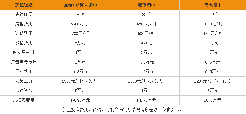 从以上可以看出,在省会城市开一家面积为30㎡的桃园灌汤包所需总投资费用为19.31万元;在地级城市开一家面积为30㎡的桃园灌汤包所需总投资费用为14.75万元;在县级城市开一家面积为30㎡的桃园灌汤包所需总投资费用为10.4万元。投资者可以根据以上信息,衡量出适合自己的加盟方式。
