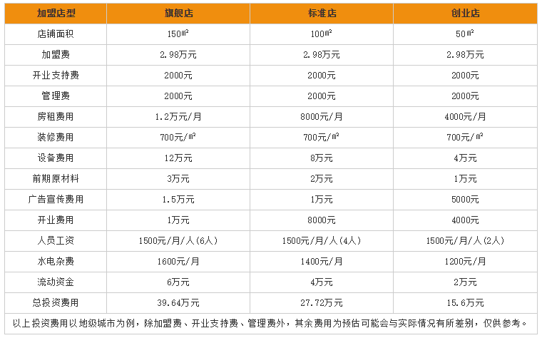 以上可以看出,面掌柜加盟费为2.98万元;开一家店铺面积为150㎡的旗舰店来说,包括所有的费用一起下来大概需要39.64万元,开一家面积为100㎡的标准店来说费用一起需要27.72万元,开一家面积为50㎡的创业店来说,所需要的总投资费用为15.6万元。最低1所有费用算下来只要15.6万元就可以开一家面掌柜加盟店!