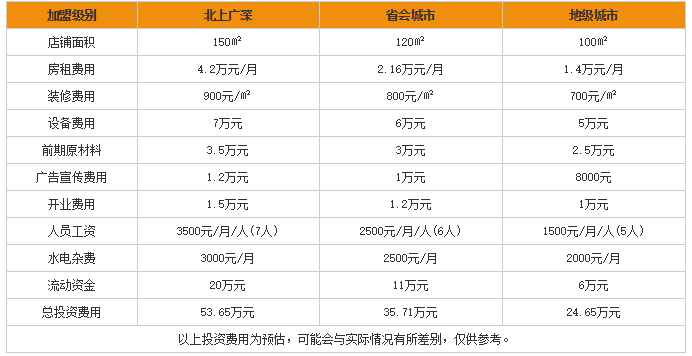 从以上可以看出,北上广深四个城市,开一家面积为150㎡的董小姐面馆需要的总投资费用在53.65万元;在省会城市开一家面积为120㎡的董小姐故事面馆需要的总投资费用为36.71万元;在地级城市开一家面积为100㎡的董小姐面馆需要投入24.65万元。最低只需24.65万元全部投入你就可以拥有一家属于自己的董小姐面馆!