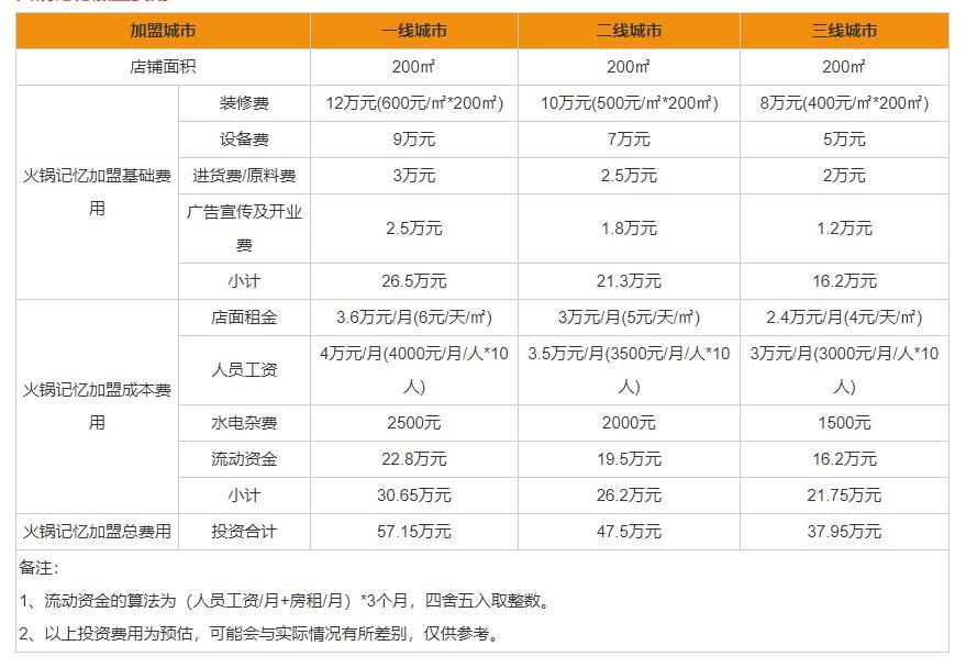 上图可以得知,火锅记忆加盟需要的费用分别是一线城市57.15万元、二线城市47.5万元、三线城市37.95万元。NkG加盟商机网