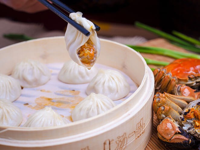 蟹黄汤包是中华传统小吃,明、清时期已经享有盛誉。其特色是皮薄如纸,吹弹即破,制作绝、形态美、吃法奇。蟹 黄汤包的制作原料十分讲究,馅为蟹黄和蟹肉,汤为原味鸡汤,制作工艺精妙绝伦。蟹黄汤包有“两绝”:一是制作绝,其制作上有三绝,一绝,面皮薄如纸,透亮明澈;二绝,馅由老母鸡汤、鸡丁、猪肉、黄酒、虾米等20多种原料拌制而成;三绝,汤色晶莹不破,口张汤满而不溢。将其撮拾到盘中更是要有高招绝技! 二是吃法绝,品尝汤包一定要记住十二字要领:轻轻提、快快移、先开窗、后喝汤。馅心精选金秋时节大河蟹、新鲜猪肉皮、正宗老母草鸡特制而成,皮薄,汤清不腻,稠而不油。汤包其用料讲究、配方独特、制作精良、难以仿制而著称,仅制作工序就多达33道。长期以来蟹黄汤包绝技传人恪守“不外传”的祖训,使其更添了几分神秘的色彩。