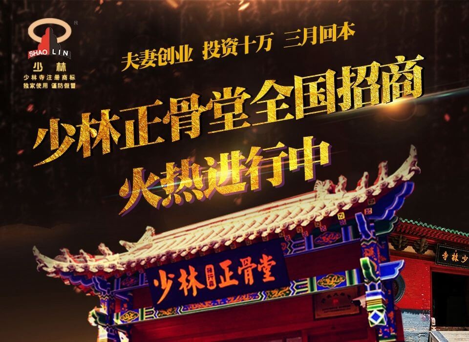 少林1500年历史,“少林”全球知名,千年品牌优势行业酒店能及;少林商标,归属少林正骨堂独家使用,千年品牌优势,省去品牌培育的过程,可快速进入市场,缩短投资回收周期。
